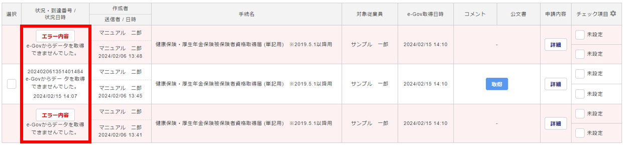 | 申請データの取得期限が経過している場合 | e-Govアプリ上でも申請データを確認することができない場合に、該当します。 最新情報を取得できる期限が過ぎており、現時点の情報より新しい情報を取得することはできません。 |