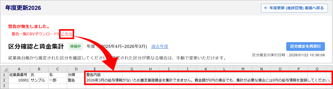 (年度更新「区分確認と賃金集計」画面、警告一覧CSV)