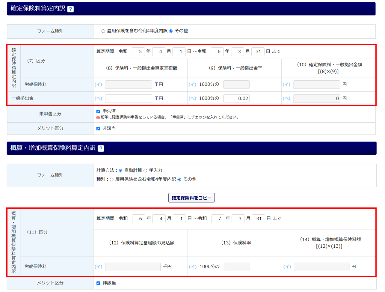※申告書画面で選択した「保険関係成立区分」の情報は、[企業情報]([士業用顧問先管理])に登録されません。