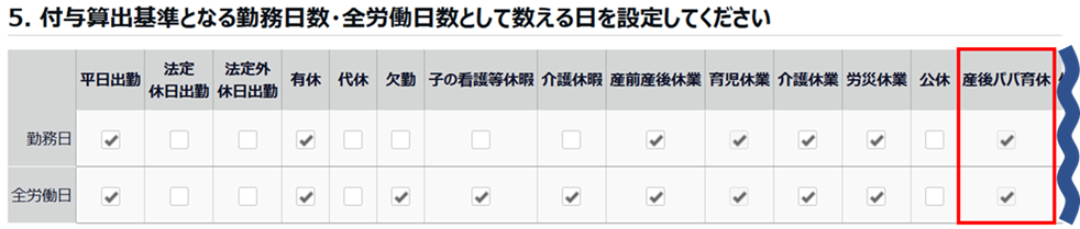 ホーム画面「設定」内[従業員]>[雇用区分設定]> 対象雇用区分の[編集]>「休暇関連」カテゴリ >「有休付与」>[有休付与関連設定]>「付与算出基準となる勤務日数・全労働日数として数える日」内の、「産後パパ育休」の「勤務日」と「全労働日」のチェックが入ります。