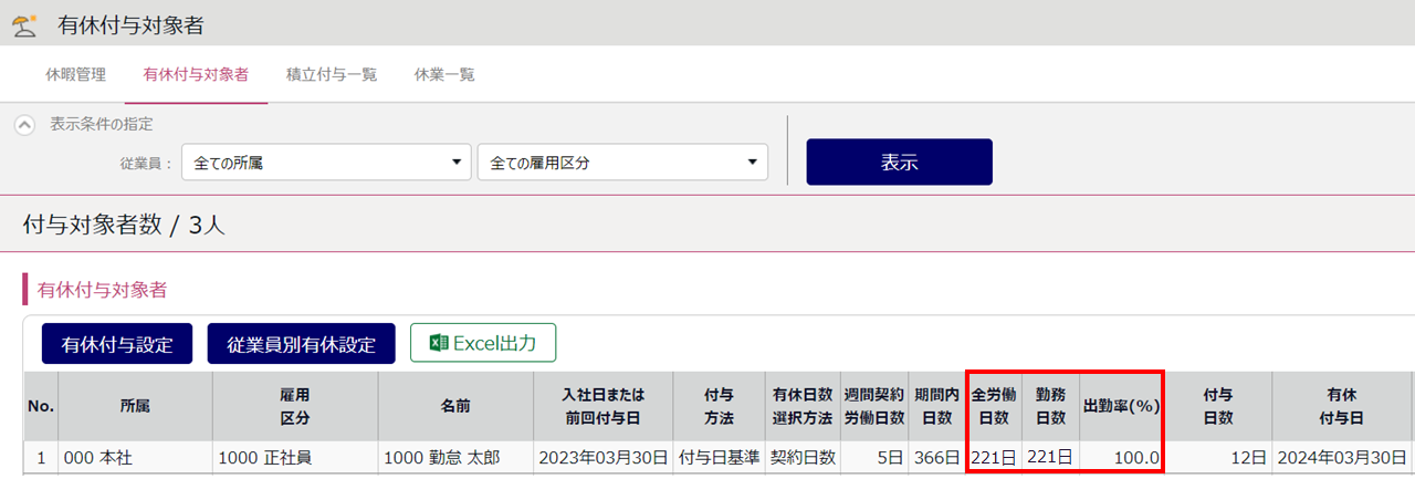 「有給休暇付与機能」の出勤率において、産後パパ育休の取得期間は出勤したものとみなして計算されます(労働義務のない休日を除く)。