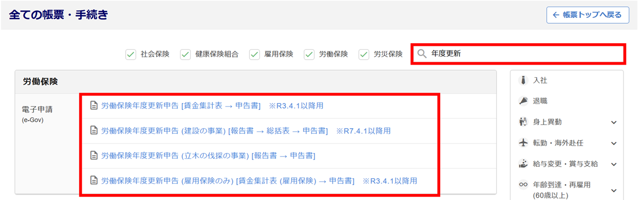 手続き選択画面にて「年度更新」と検索し、表示される帳票から申請してください。