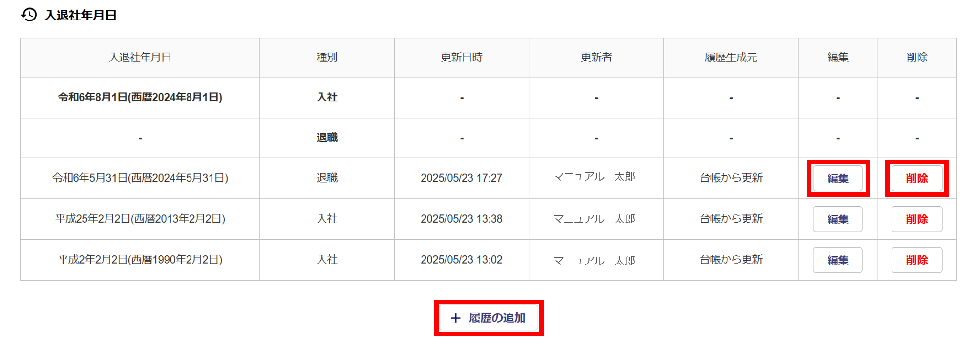 「日付」や「入社・退職」の種別情報の編集が必要な場合は、[編集]から編集、不要な情報は[削除]から削除(②)、情報の追加が必要な場合は、[履歴の追加](③)から登録します。