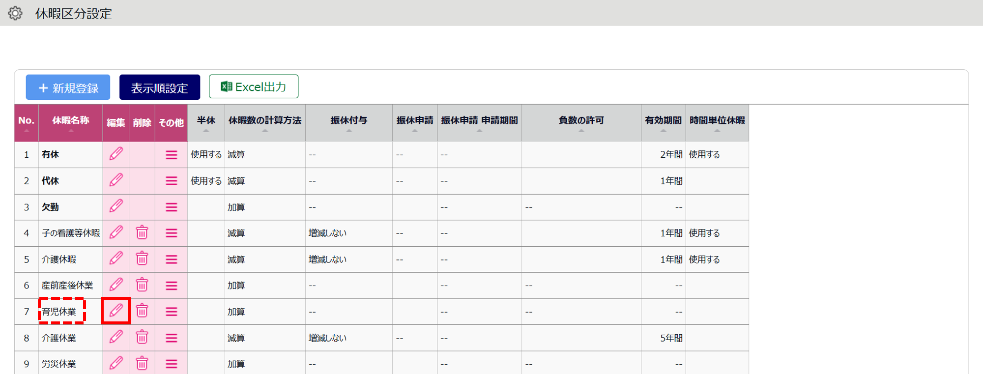 「育児休業」という名称の休暇区分が表示されている場合は、[編集]をクリックします。表示されていない場合は、[+新規登録]をクリックします。