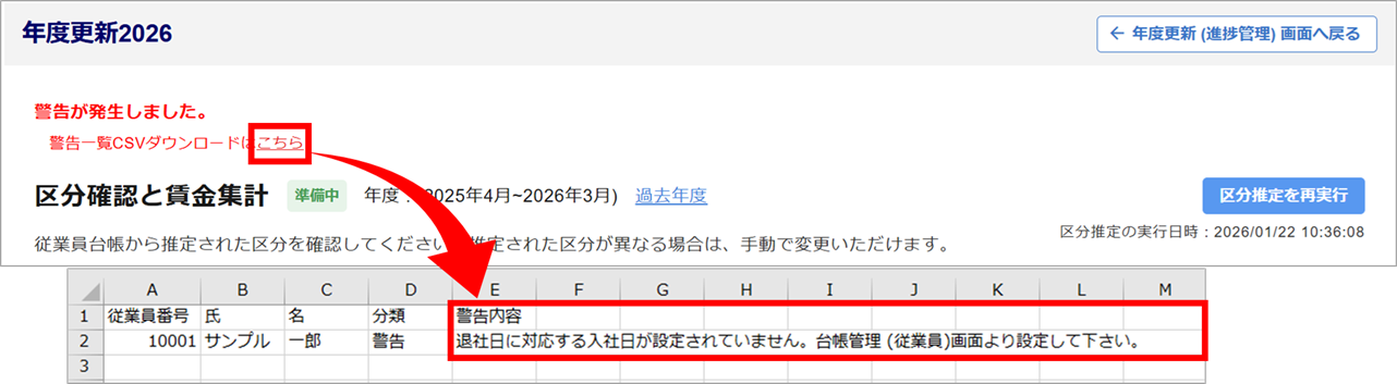 従業員情報の「本人情報」カテゴリ内「入社年月日」項目が未設定の場合に本警告が発生します。「退職年月日」項目を設定している場合、対になる「入社年月日」項目は必ず設定してください。※警告のため問題がなければ、「区分確認と賃金集計の完了」することは可能です。
