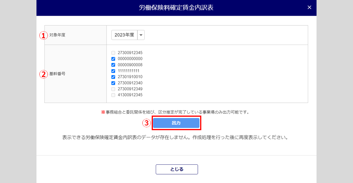 「対象年度」()を選択し、帳票に出力する「基幹番号」()にチェックし、[出力]()をクリックします。