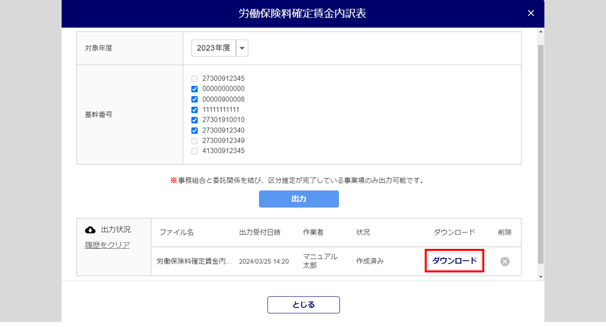 ウィンドウ下部に「出力状況」欄が表示されます。[ダウンロード]をクリックし、出力した帳票ファイルをダウンロードします。
