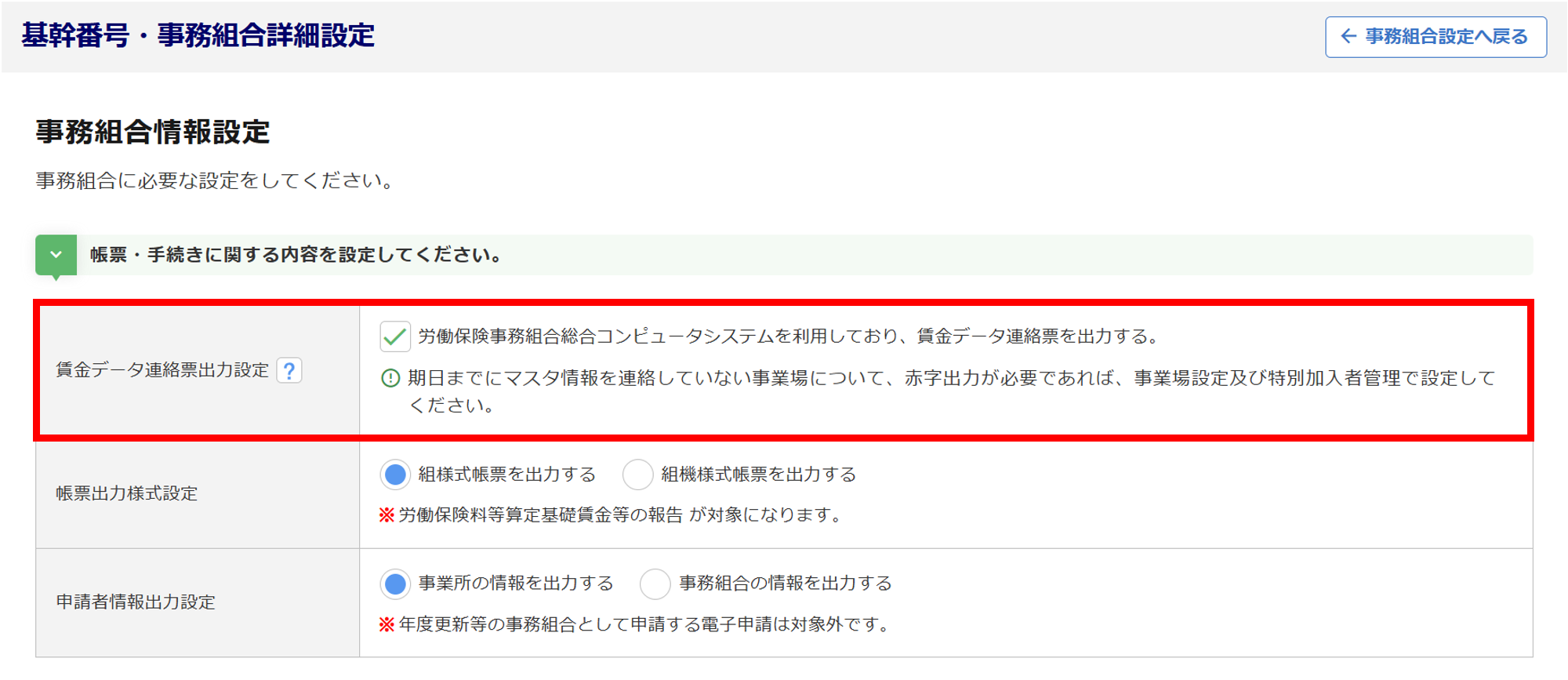 事務組合機能にて、全国労働保険事務組合連合会提出用の「賃金データ連絡票」を出力できるように設定します。