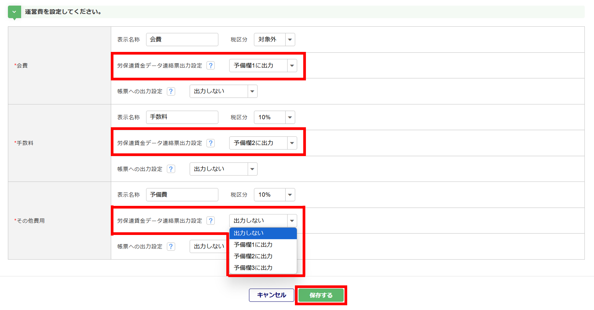 また、帳票の予備欄に「運営費」を出力するのかも合わせて、設定します。