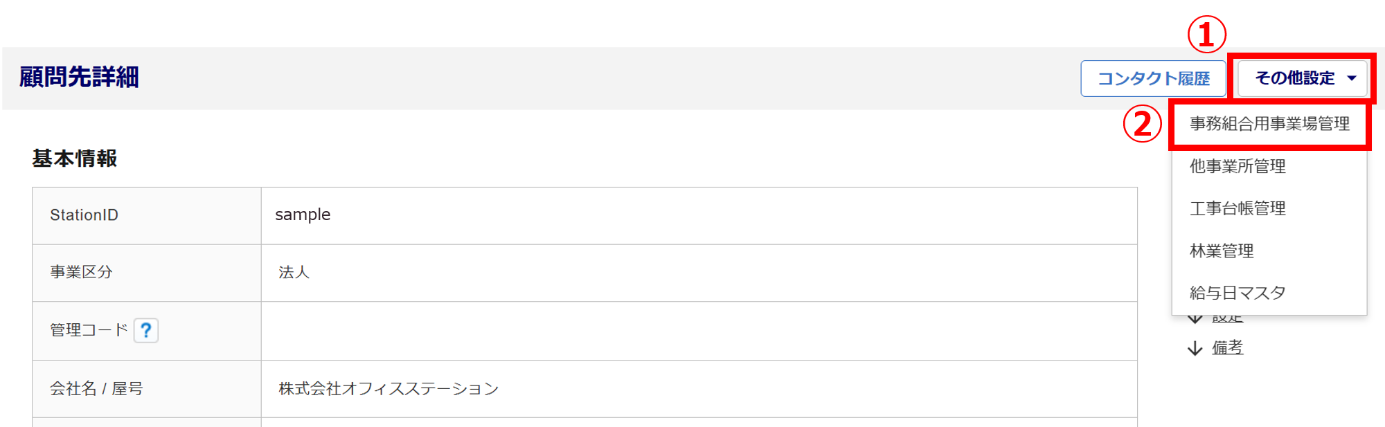 [その他設定](①)>[事務組合用事業場管理](②)をクリックします。