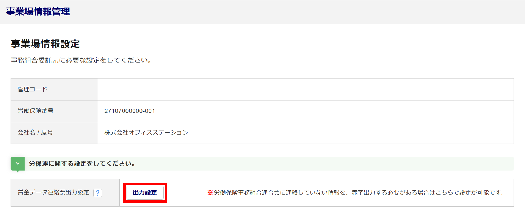 本マニュアル内「事務組合情報設定」にて、「賃金データ連絡票出力設定」項目の設定が完了していない場合、[出力設定]ボタンは表示されません。