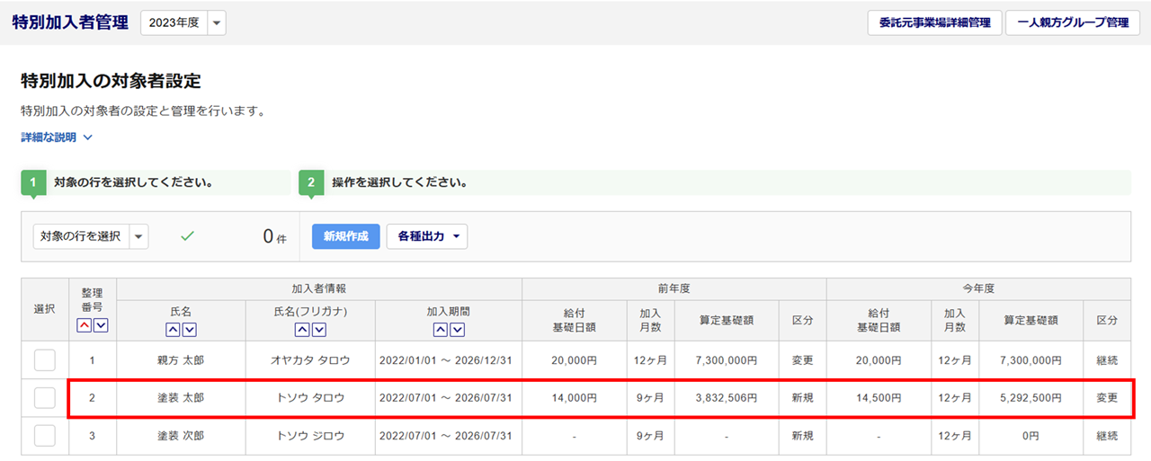 対象の特別加入者の行をクリックします。