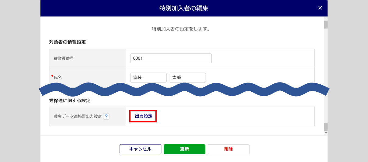 賃金データ連絡票の出力の有無や赤字出力などの設定をおこなう場合、[出力設定]をクリックします。