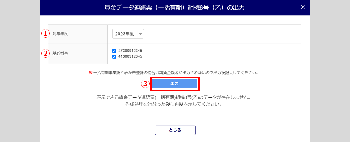 「賃金データ連絡票(継続)組機6号(甲)の出力」または「賃金データ連絡票(一括有期)組機6号(乙)の出力」ウィンドウが表示されます。