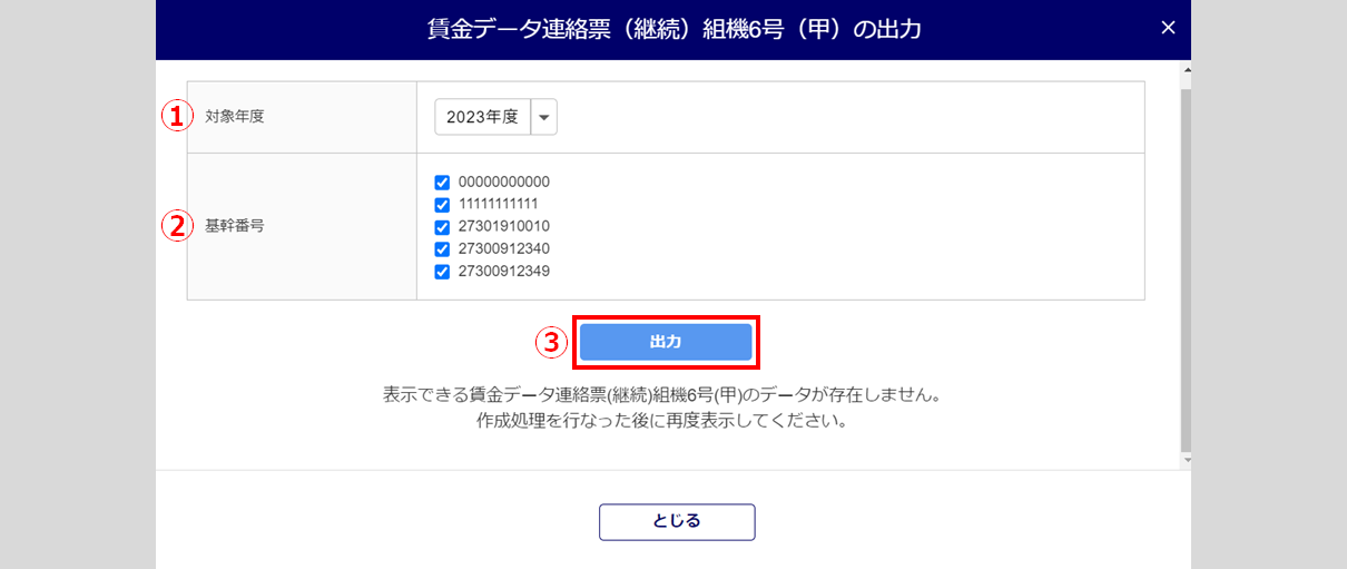 「対象年度」(①)を選択し、帳票に出力する「基幹番号」(②)にチェックし、[出力](③)をクリックします。