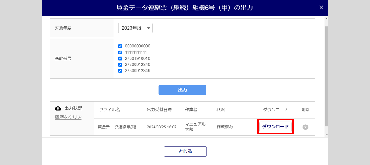 ウィンドウ下部に「出力状況」欄が表示されます。[ダウンロード]をクリックし、出力した帳票ファイルをダウンロードします。