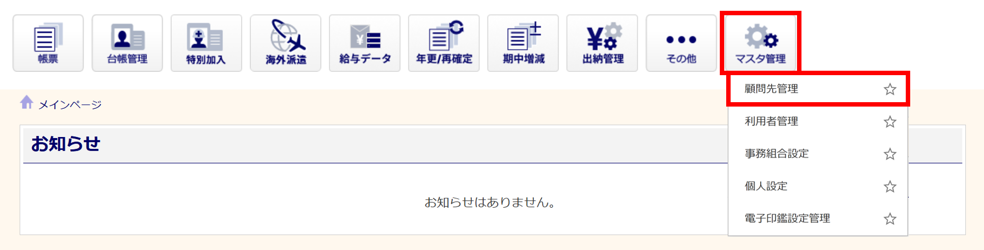 [マスタ管理]>[顧問先管理]をクリックします。