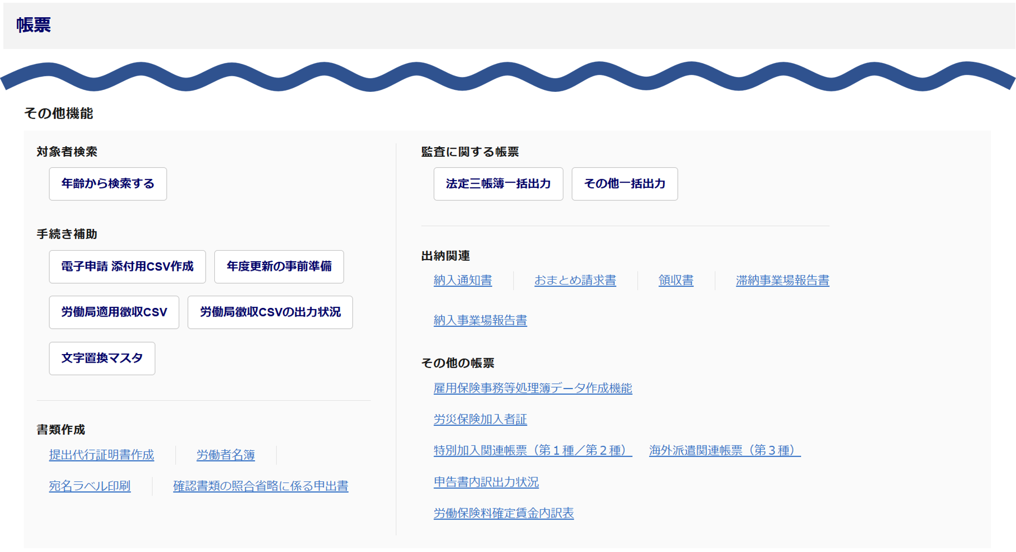 「その他機能・その他の帳票」内[賃金データ連絡票(継続)組機6号(甲)]、または、[賃金データ連絡票(一括有期)組機6号(乙)]をクリックします。