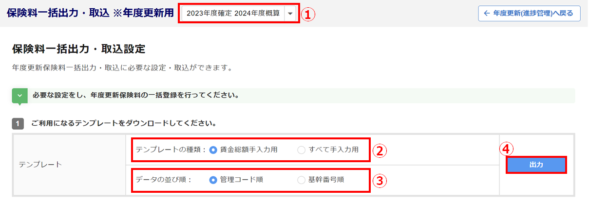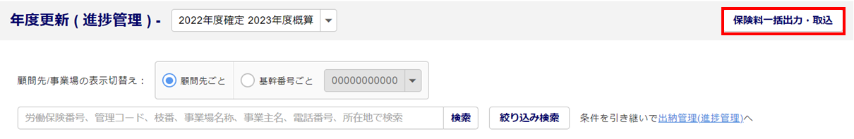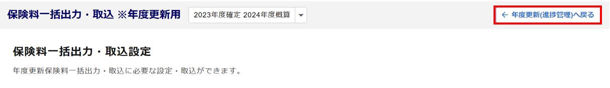 「保険料一括出力・取込設定」画面の右上にある[年度更新(進捗管理)へ戻る]をクリックします。