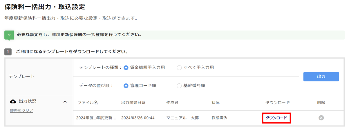 「出力状況」欄が表示されます。[ダウンロード]をクリックし、テンプレートをダウンロードします。