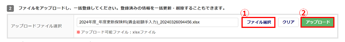 [ファイル選択](①)をクリックし、保存したファイルを選択、[アップロード](➁)をクリックします。