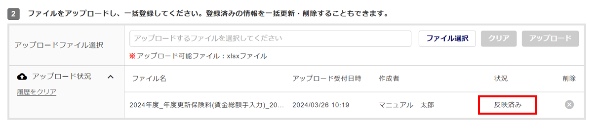 「アップロード状況」欄が表示されます。「状況」に「反映済み」と表示されたら、取込は完了です。