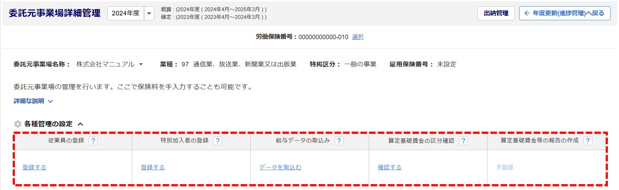 「委託元事業場詳細管理」画面の[保険料の編集]>[賃金総額手入力]に相当します。