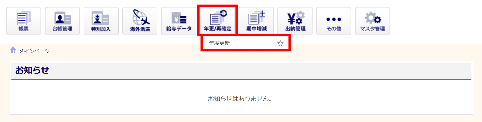 または、事務組合ホーム画面[年更/再確定]をクリックします。