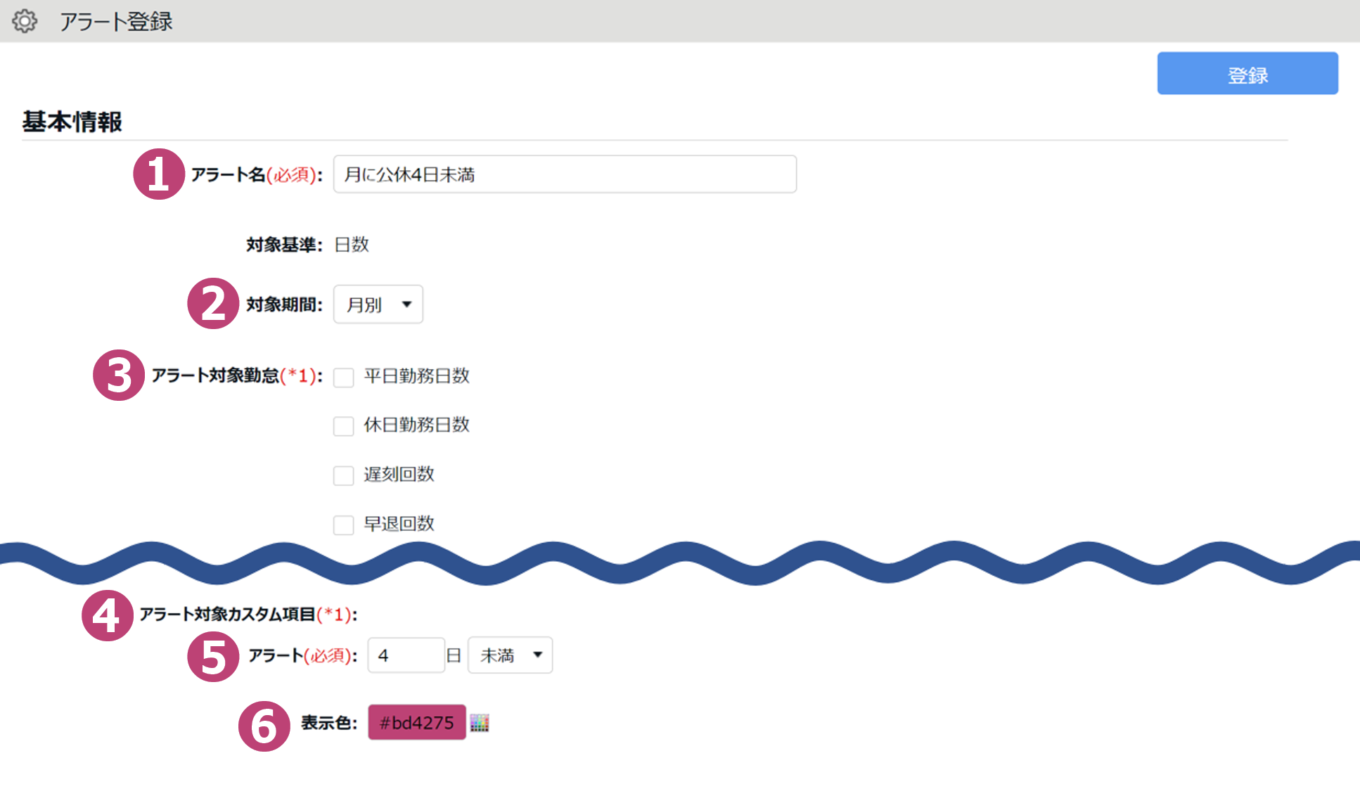 | アラート | アラートの基準値を入力します。 ●「超過」「未満」はその値を含みません。 ●「以上」「以下」はその値を含みます。 例えば、休暇取得日数を4日「未満」と設定した場合は、4日はアラート対象になりません。休暇取得日数が0日~3日である場合にアラート表示されます。 |
