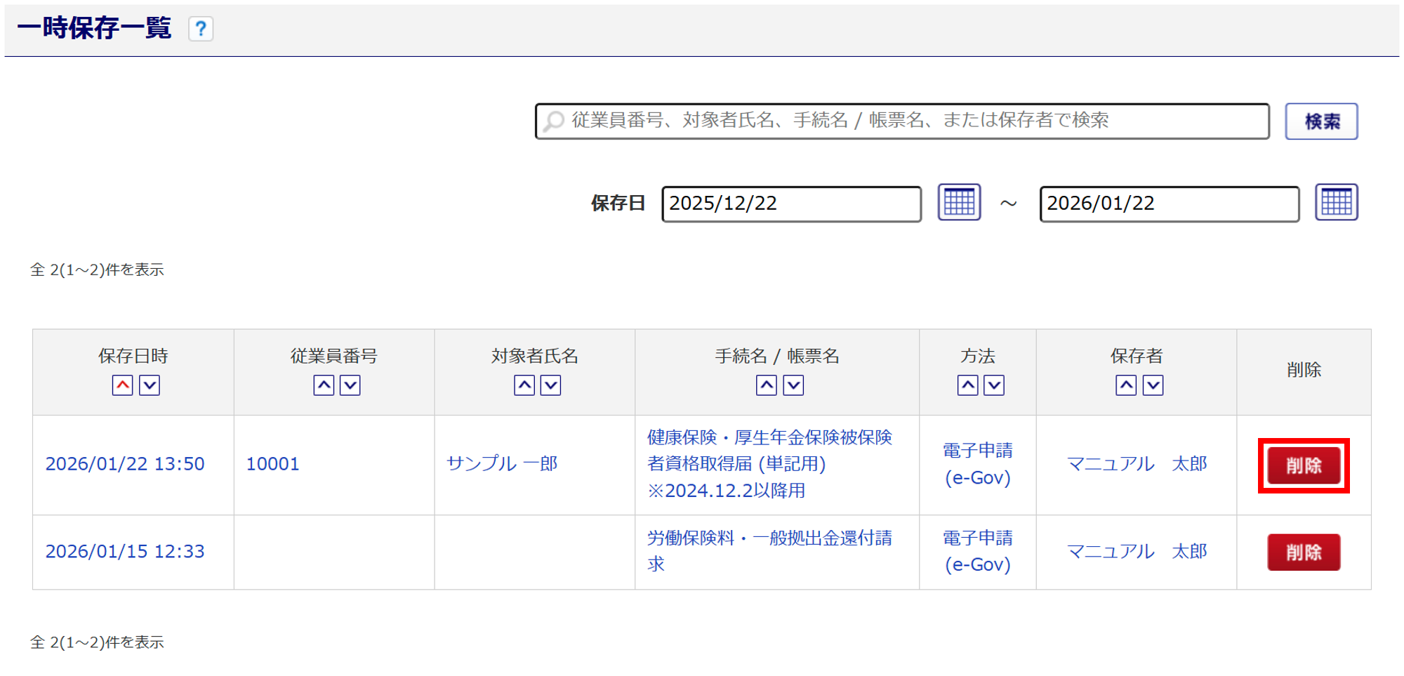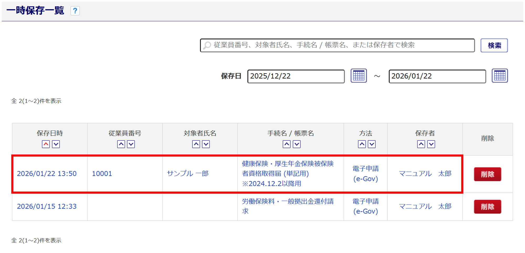 初期表示で、「保存日」が直近1カ月以内の申請データが表示されます。