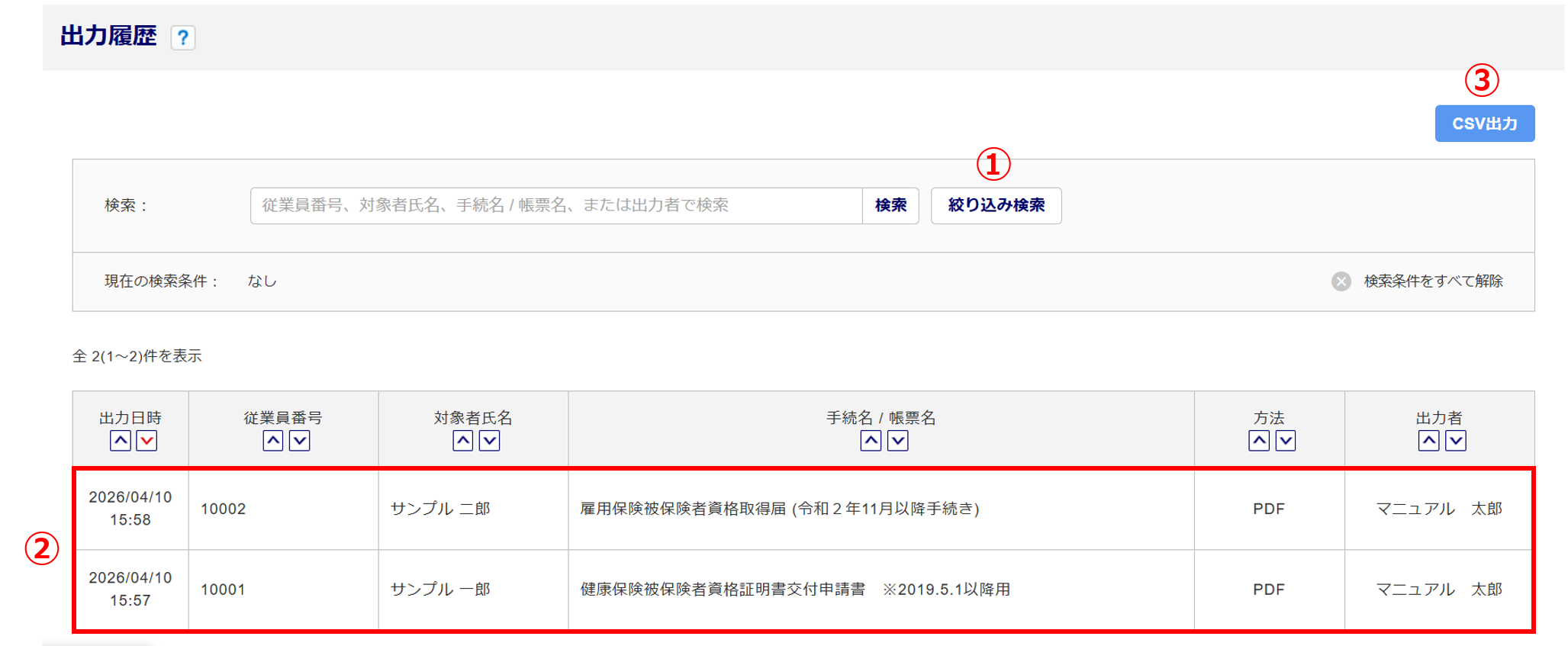 | ① | 絞り込み検索 | 出力日時、手続種別、手続名/帳票名、対象者氏名、従業員番号、出力者名の条件を指定して絞り込み検索ができます。 |
