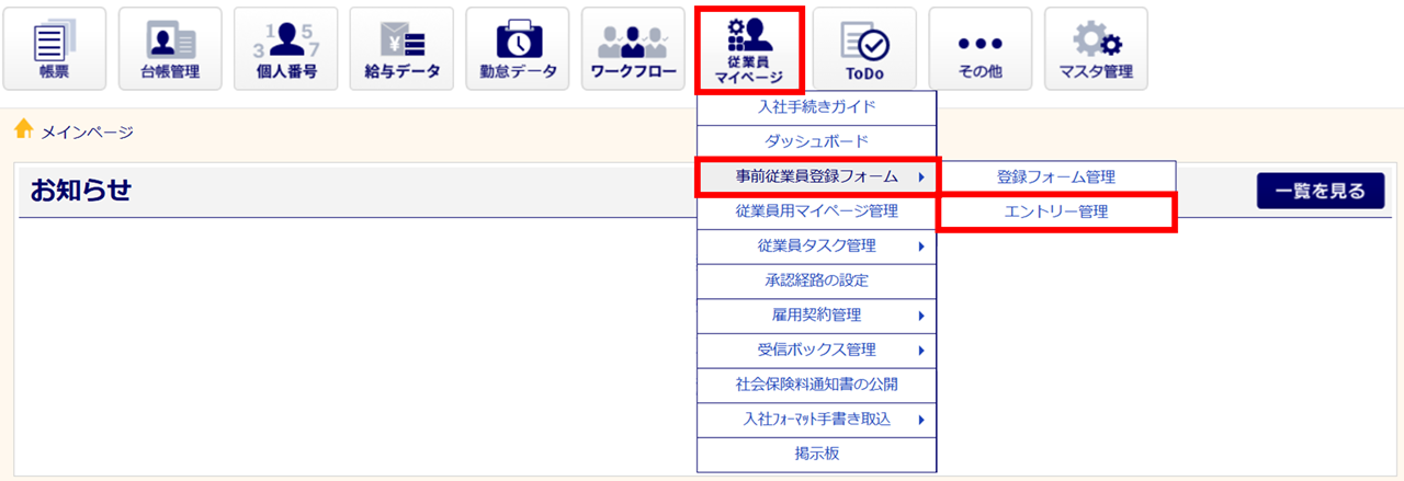 [従業員マイページ]>[事前従業員登録フォーム]>[エントリー管理]をクリックします。