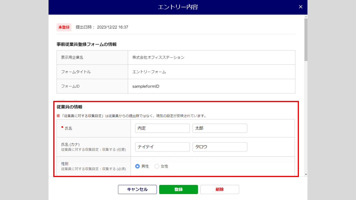 入社前の従業員から提出された事前従業員登録フォームの情報が表示されます。