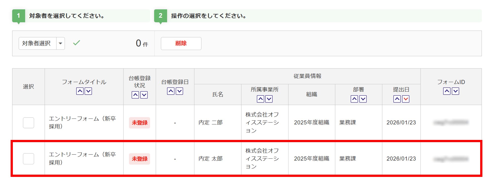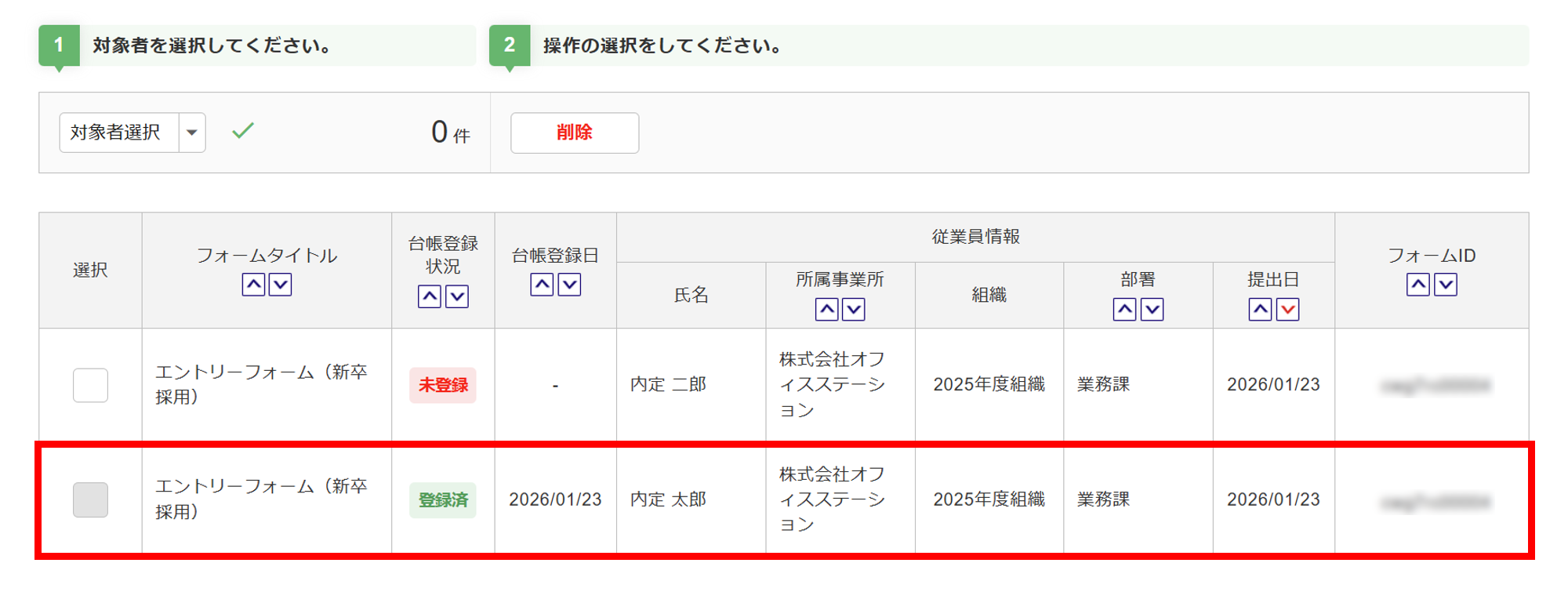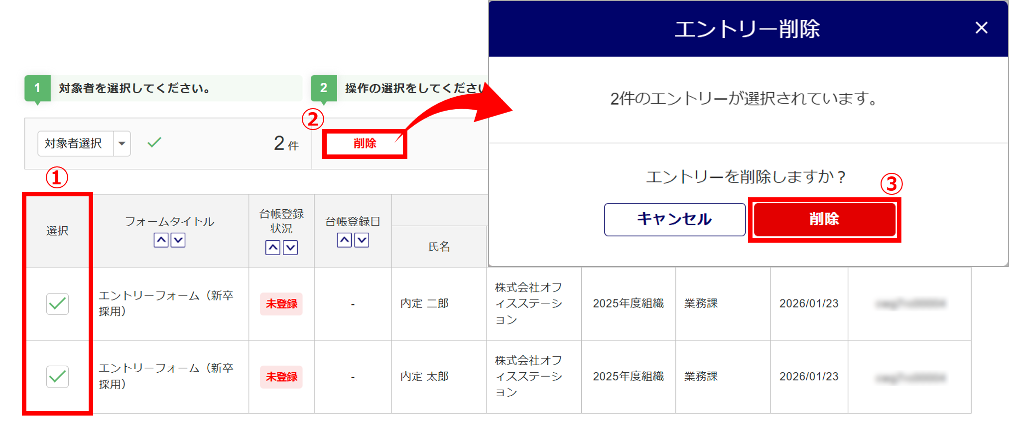従業員から提出されたエントリーを削除する場合は、「選択」列(①)をチェックし、[削除](②)>[削除](③)をクリックします。