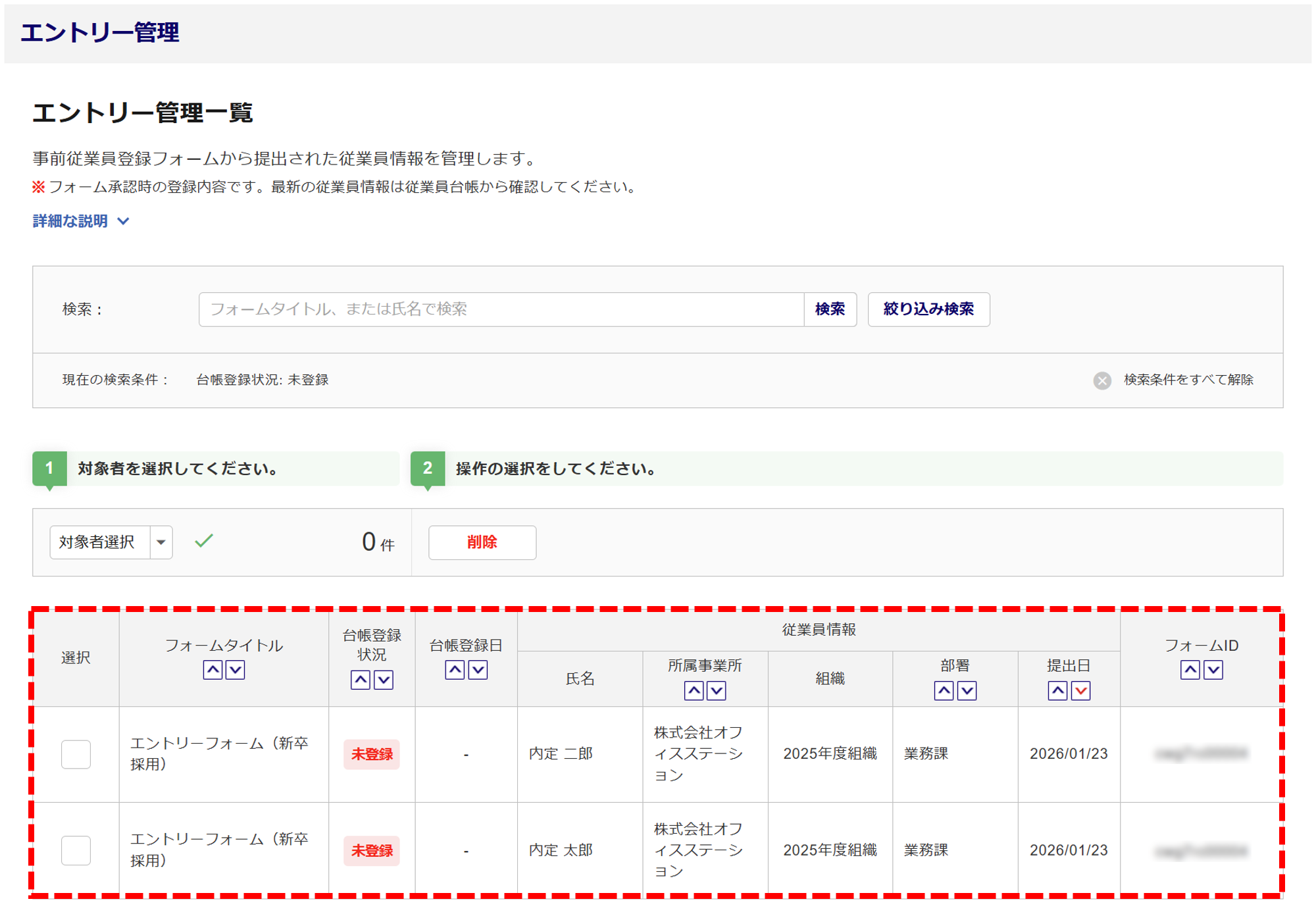 「エントリー管理一覧」画面の初期表示では、従業員台帳に未登録の情報のみが表示されています。
