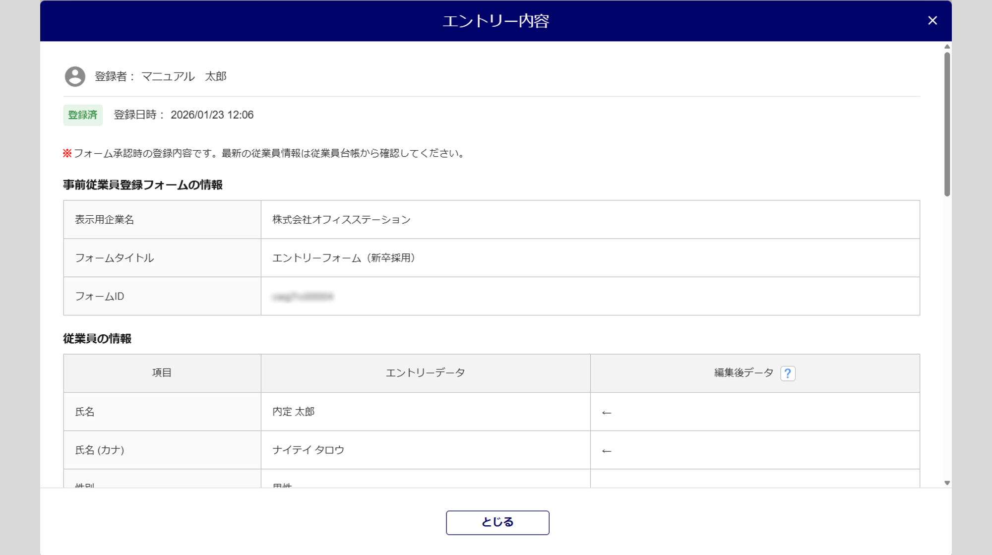 表示される情報は、エントリー内容を従業員台帳に登録時の情報です。最新の情報は従業員台帳をご確認ください。