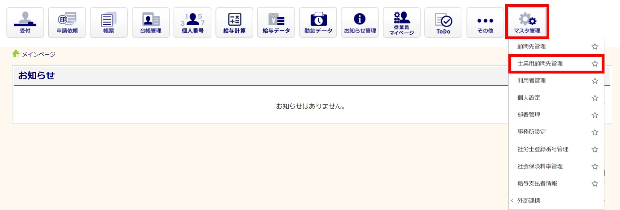 [マスタ管理]>[士業用顧問先管理]をクリックします。