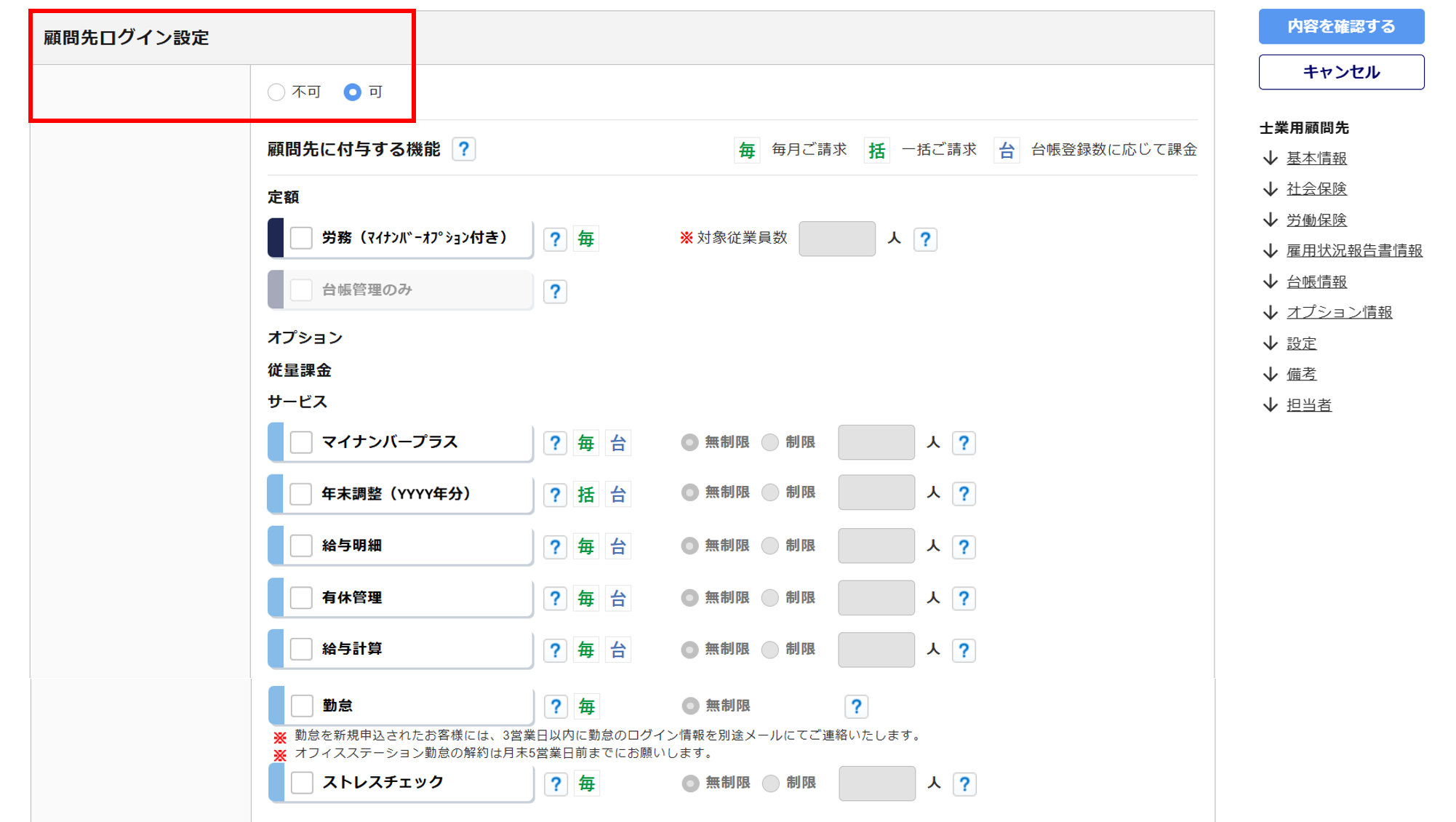 「顧問先ログイン設定」を「可」とした場合、対象の顧問先企業へ付与する機能の設定をおこないます。