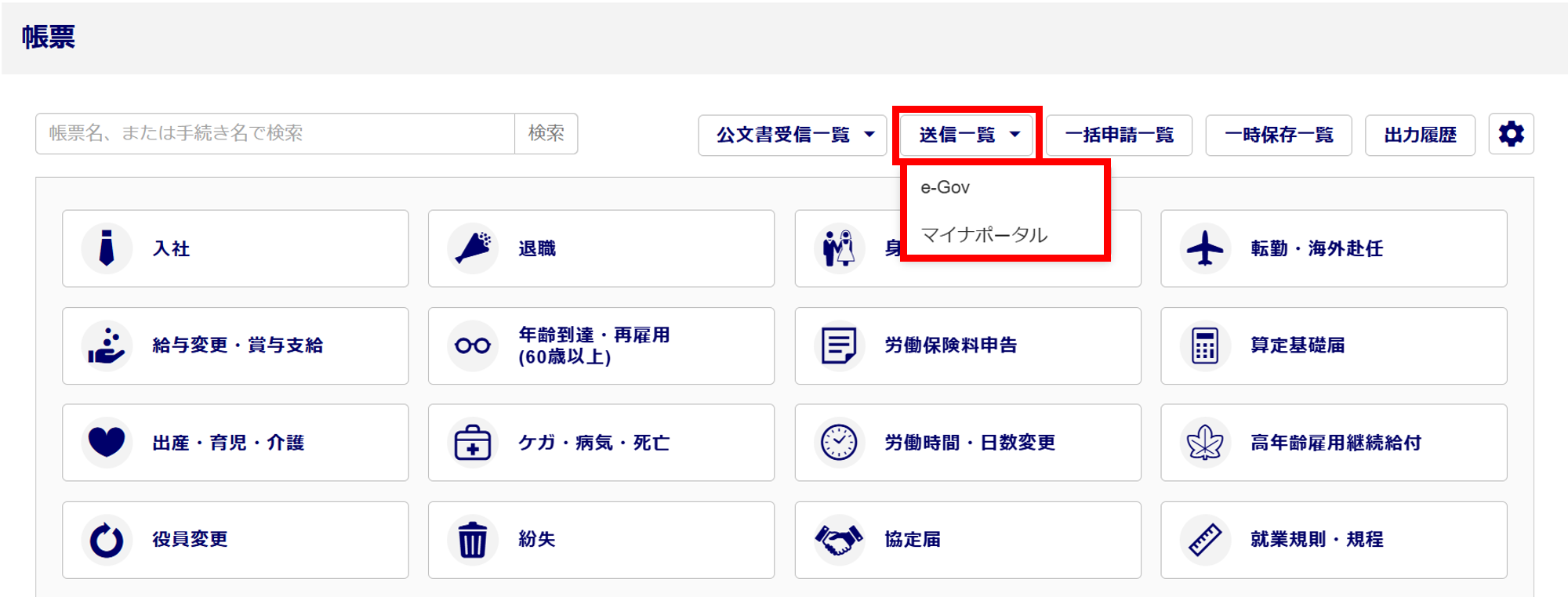 [送信一覧]>[e-Gov]もしくは[マイナポータル]をクリックします。
