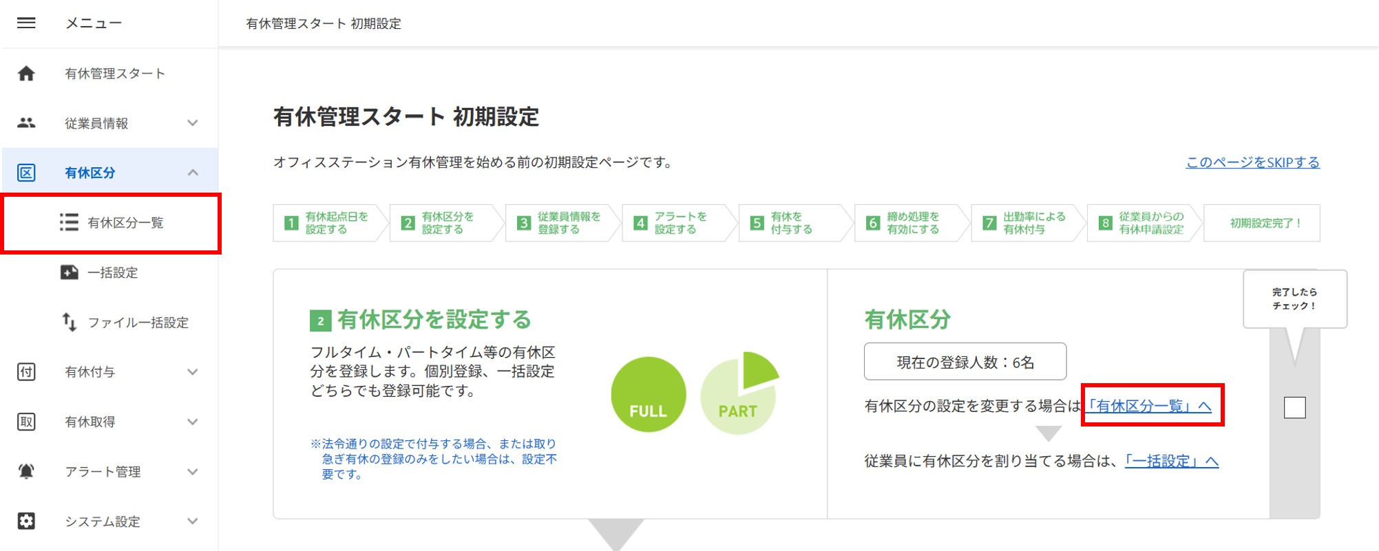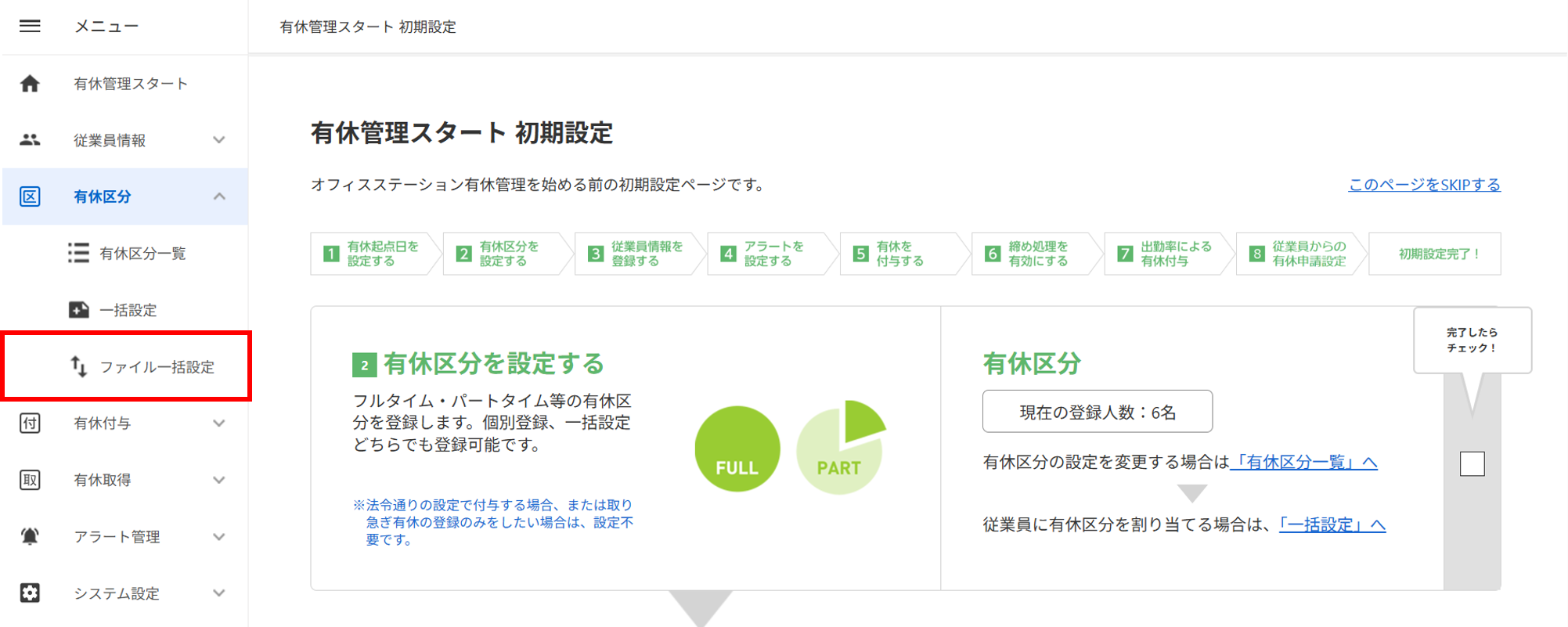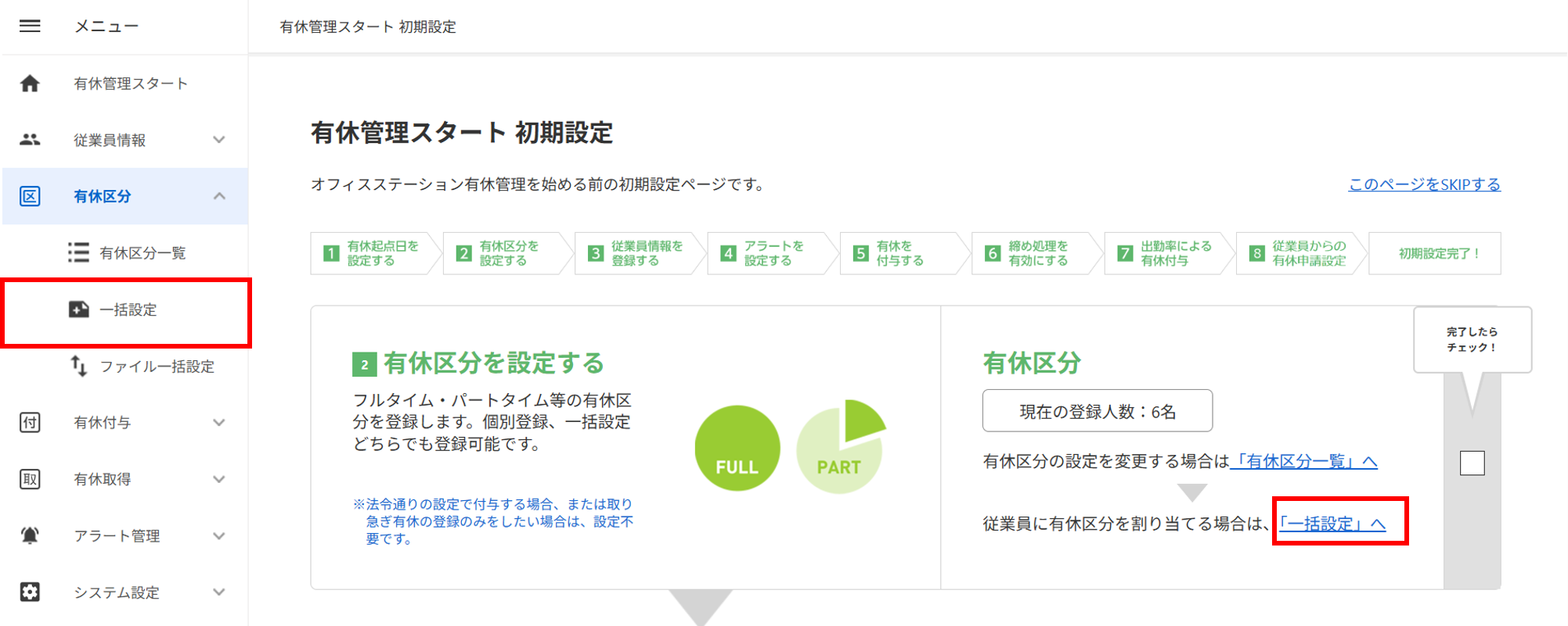 画面上部に「有休区分の一括設定が完了しました。」と表示されたら設定完了です。