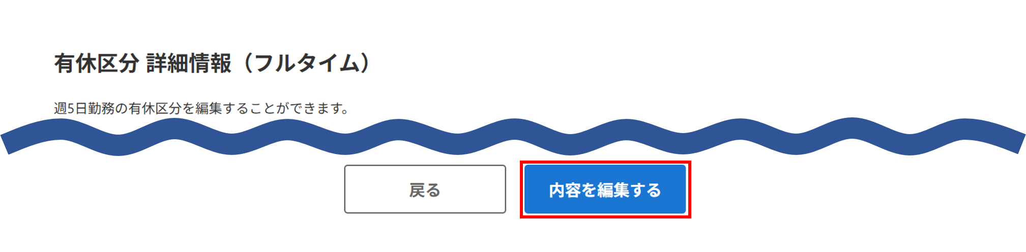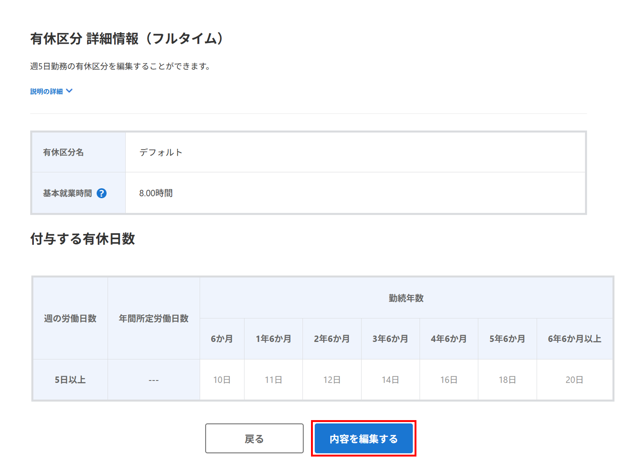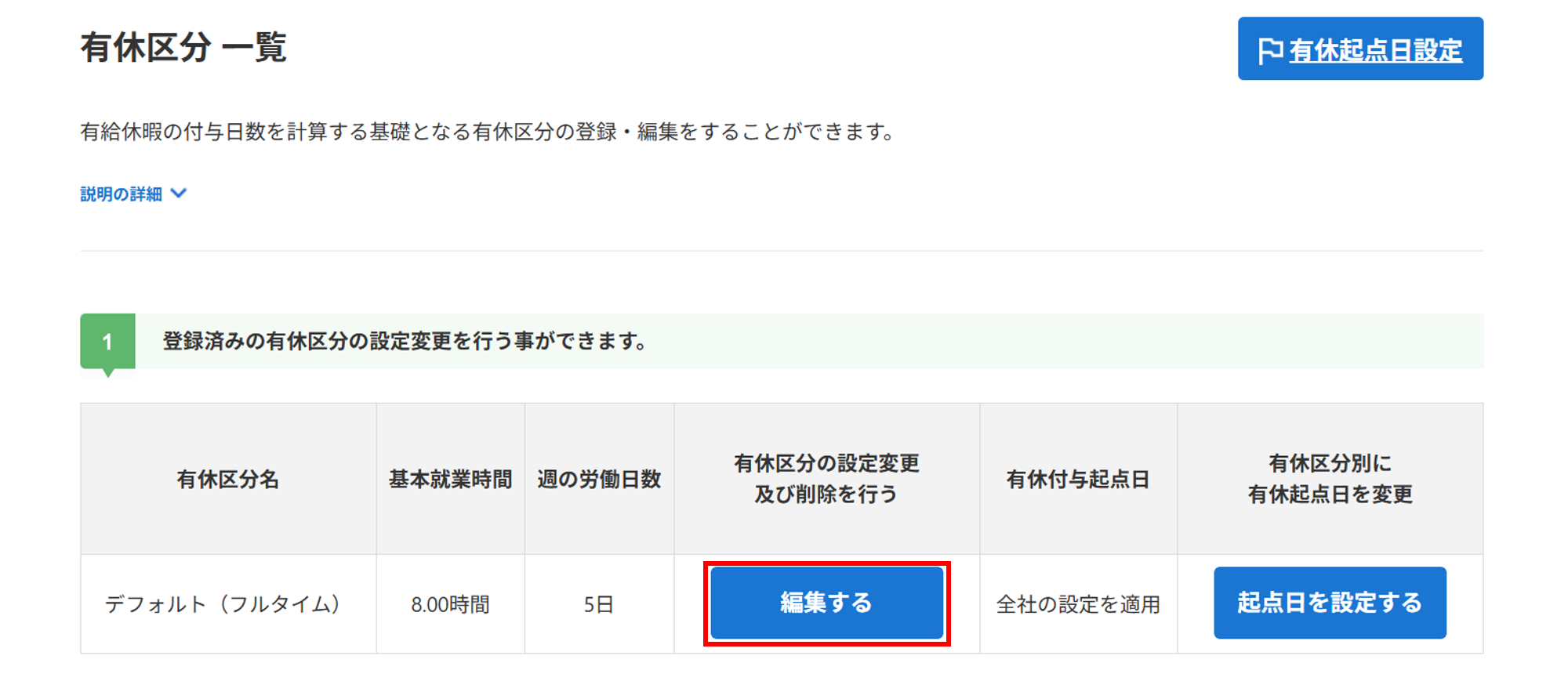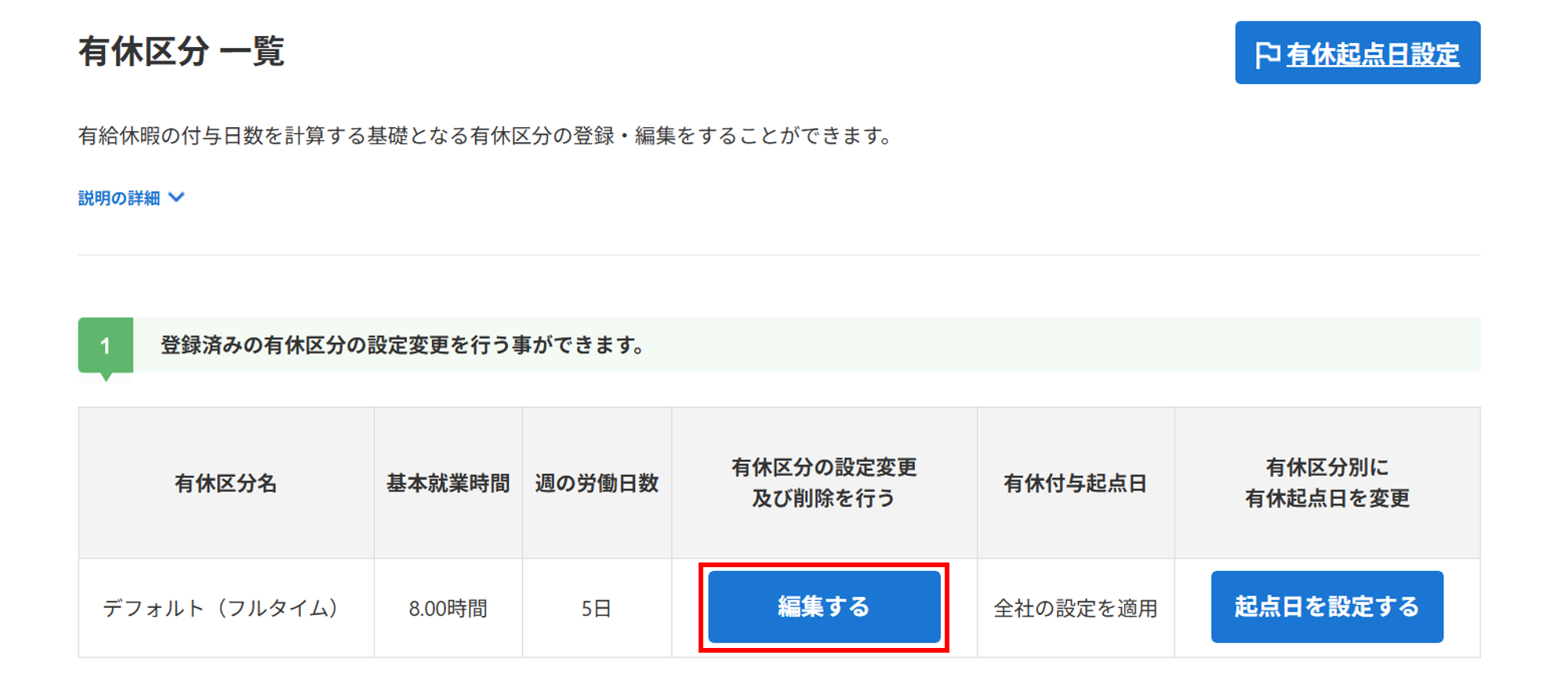 登録済みの「デフォルト(フルタイム)」の修正をおこなう場合、該当区分欄の[編集する]をクリックします。