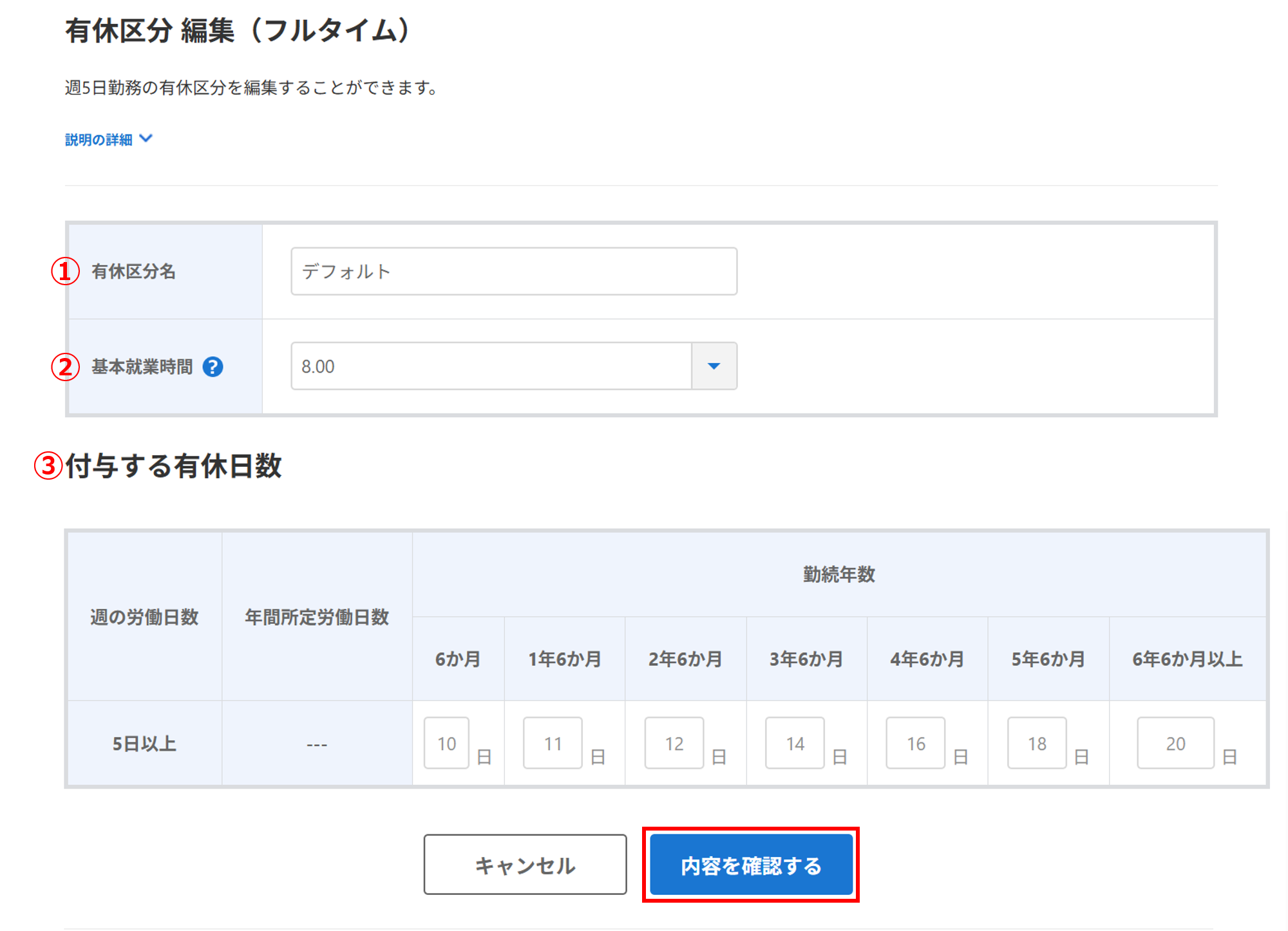 | ② | 基本就業時間 | 一日の就業時間を設定します。 付与される有給休暇のうち、基本就業時間 ✖ 5日の時間分が時間単位で取得できる有給休暇の上限となります。 |