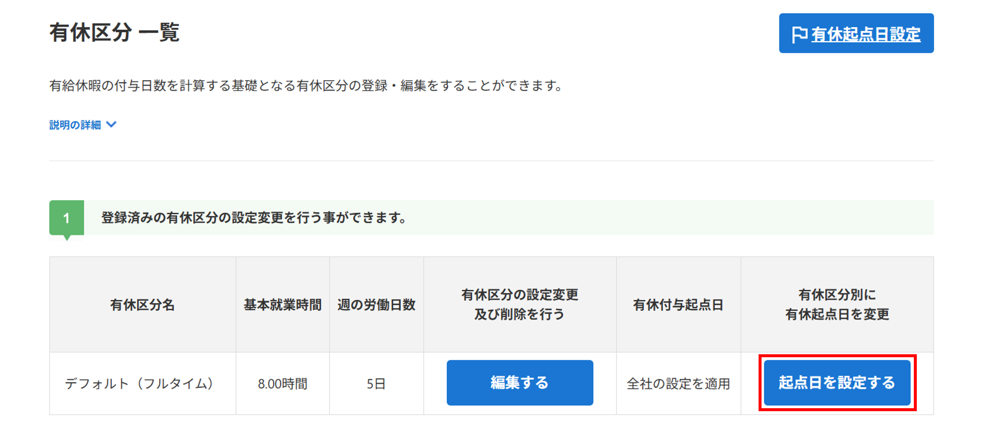 画面上部に「有休区分別の起点日設定が完了しました。」と表示されたら設定完了です。