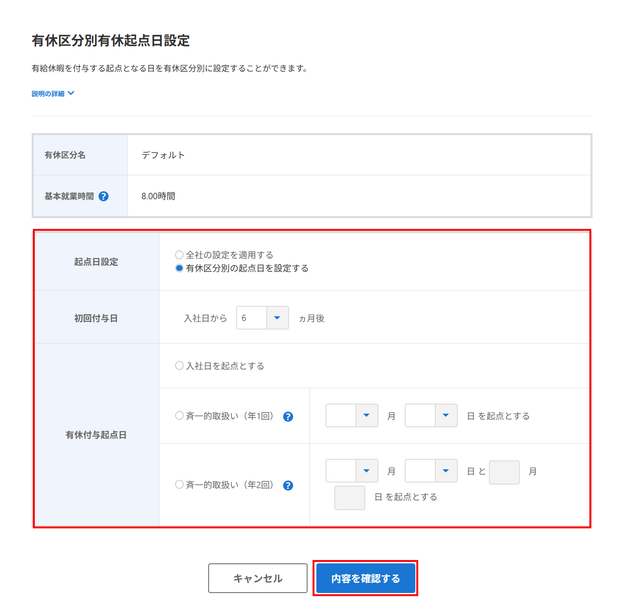 [有休起点日設定]で設定した会社全体の設定を適用するか、有休区分ごとに有休起点日の設定をおこないます。