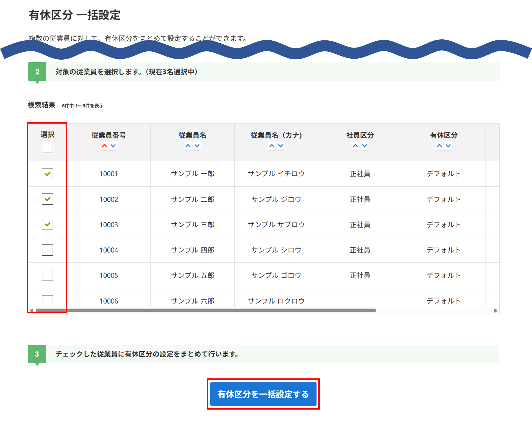 対象従業員の「選択」列にチェックをつけ、[有休区分を一括設定する]をクリックします。