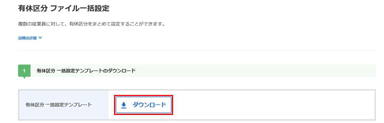 [ダウンロード]をクリックし、有休区分一括設定テンプレートをダウンロードします。
