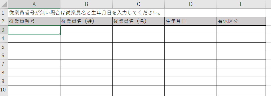 ダウンロードしたテンプレートを開き、有休区分を設定する従業員の情報と有休区分を入力し、保存します。