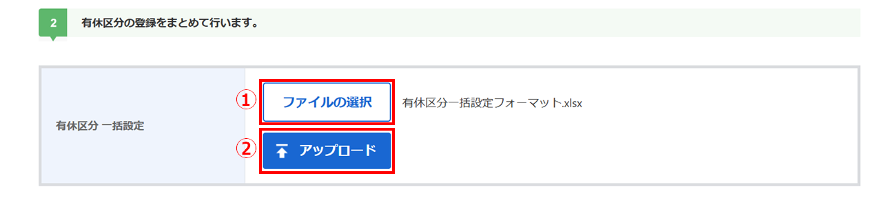 [ファイルの選択](①)をクリックし、保存したテンプレートを選択後、[アップロード](②)をクリックします。