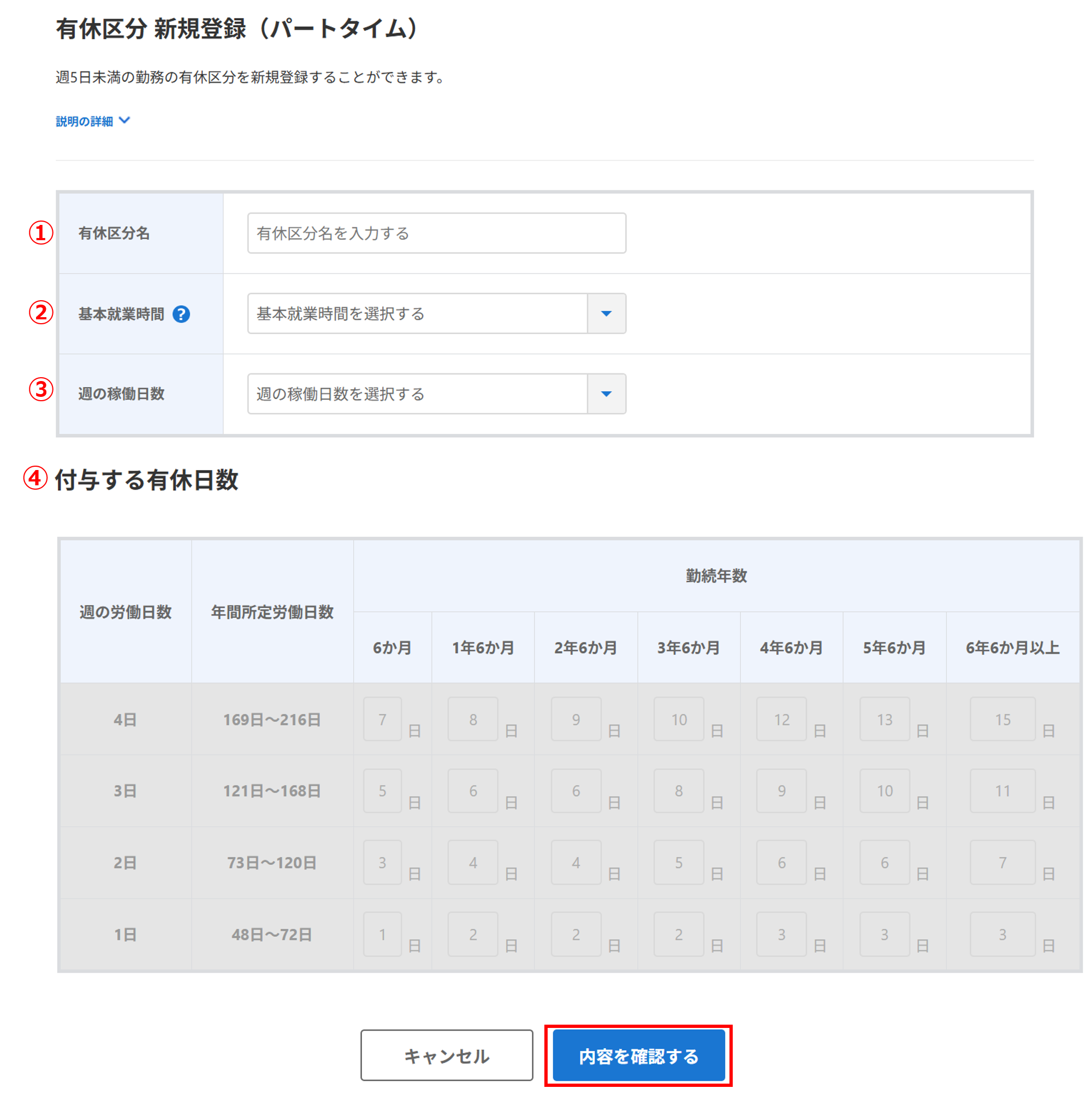 | ④ | 付与する有休日数 | 勤続年数ごとに付与する有休日数を設定します。「③週の稼働日数」で設定した日数の行のみ設定できます。 |