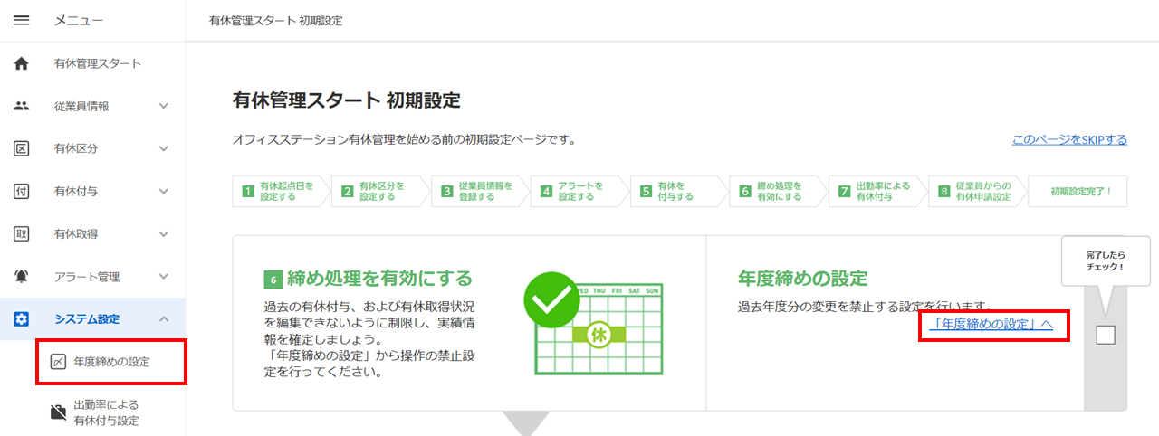有休管理スタート初期設定[6 締め処理を有効にする]>[「年度締めの設定」へ]をクリックします。